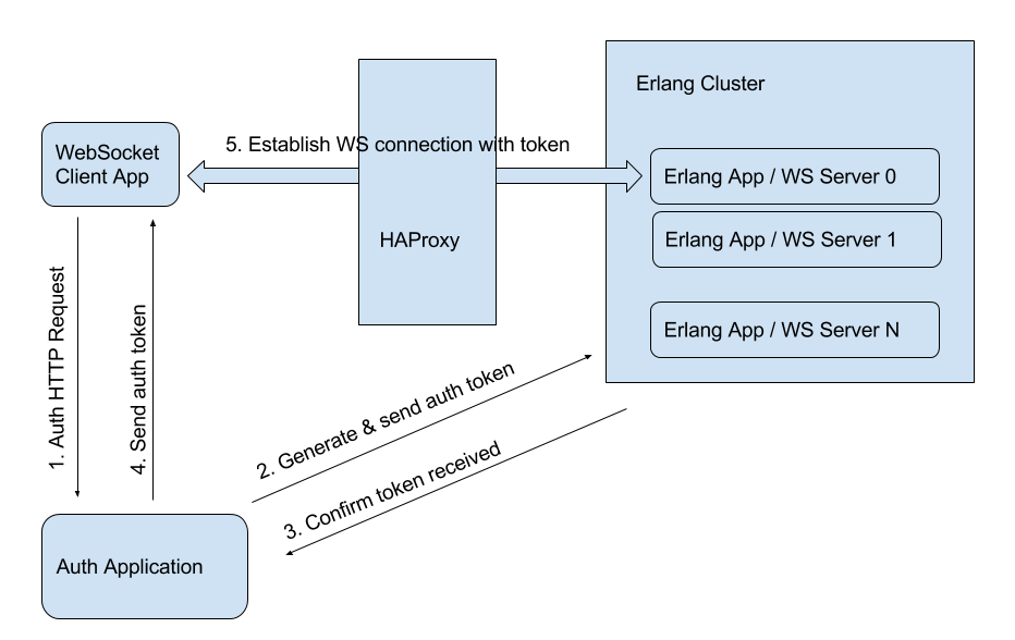 • 客戶端使用令牌通過我們的 HAProxy 負載均衡器與 Erlang 應用程序建立 websocket 連接。