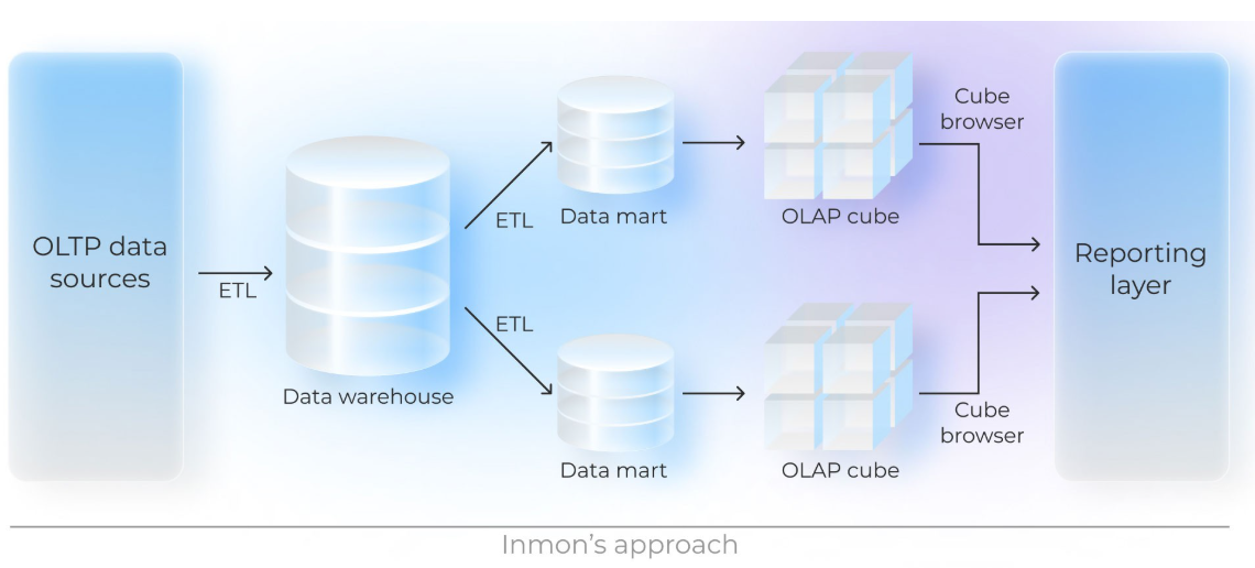 有兩種傳統的設計方法用于構建數據倉庫架構:Inmon 的方法和 Kimball 的方法。在應用前者時,數據架構師首先設計一個集中式存儲,然后從匯總的數據倉庫和元數據創建數據集市。后者遵循相反的過程:最初創建數據集市,然后從獨立的數據集市開發數據倉庫數據庫。